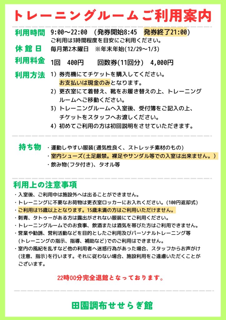 体育施設 トレーニングルームご利用案内&利用料金改定のお知らせ