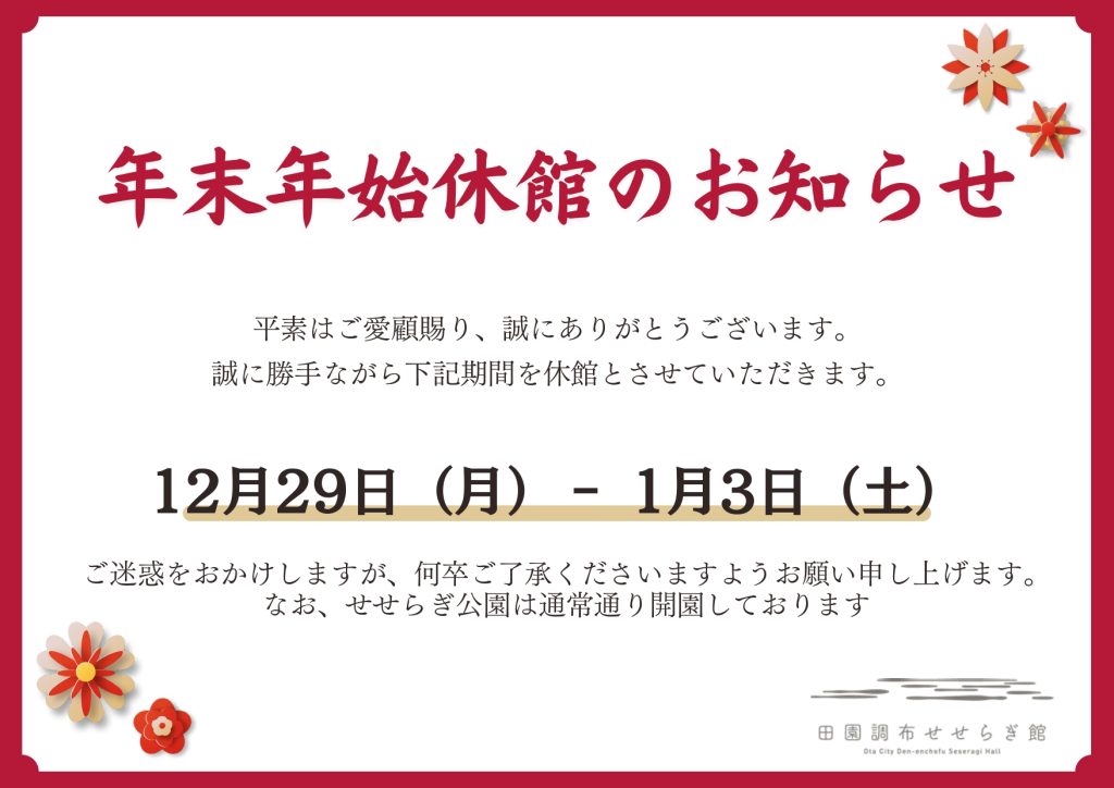 年末年始は12月29日(月)~1月3日(土)まで休館となります。