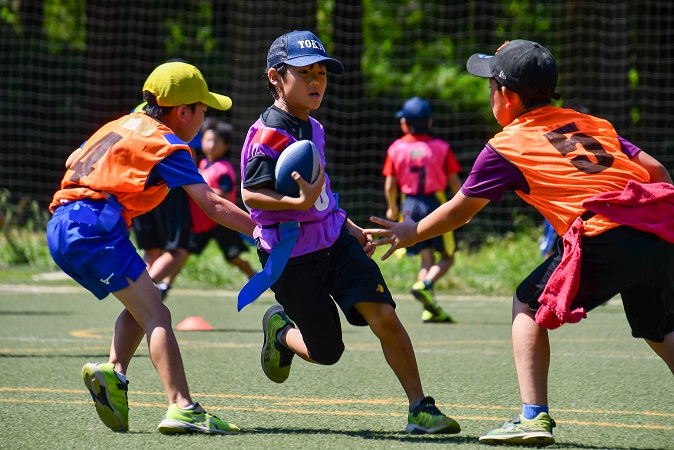 走って!キャッチして!フラッグ取って!誰でも楽しめるアメリカンフットボールから生まれた、タックルのない安全なスポーツ!腰に付けた「フラッグ」を取り合うだけだから、小さな子供でも安心して参加できます。